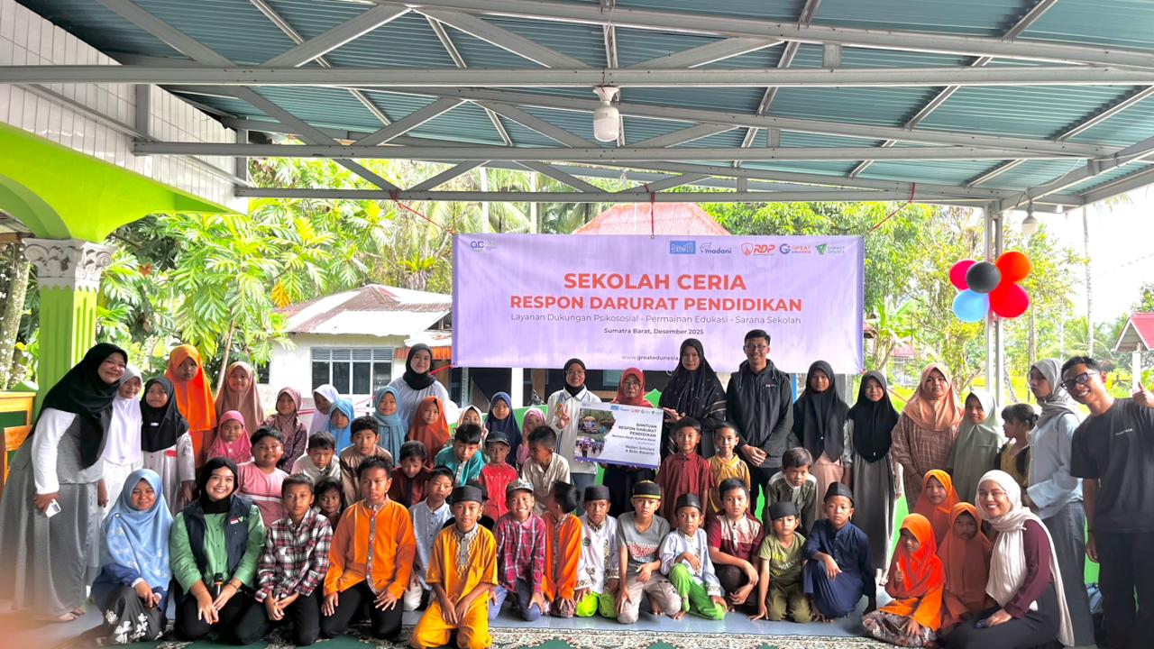 Alhamdulillah, donasi kamu sudah tersalurkan melalui kegiatan Sekolah Ceria yang dilaksanakan pada 28 Desember 2025 di Sumatra Barat untuk anak-anak terdampak bencana. Kegiatan ini diikuti oleh 43 siswa dan didampingi oleh 10 relawan Tim Respon Darurat Pendidikan GREAT Edunesia Dompet Dhuafa, bersama relawan komunitas, serta didukung oleh Dompet Dhuafa bersama Madani Scholar dan Buku Bacarito sebagai bentuk respon pendidikan pascabencana.