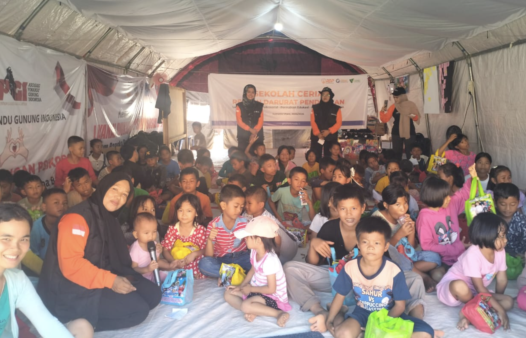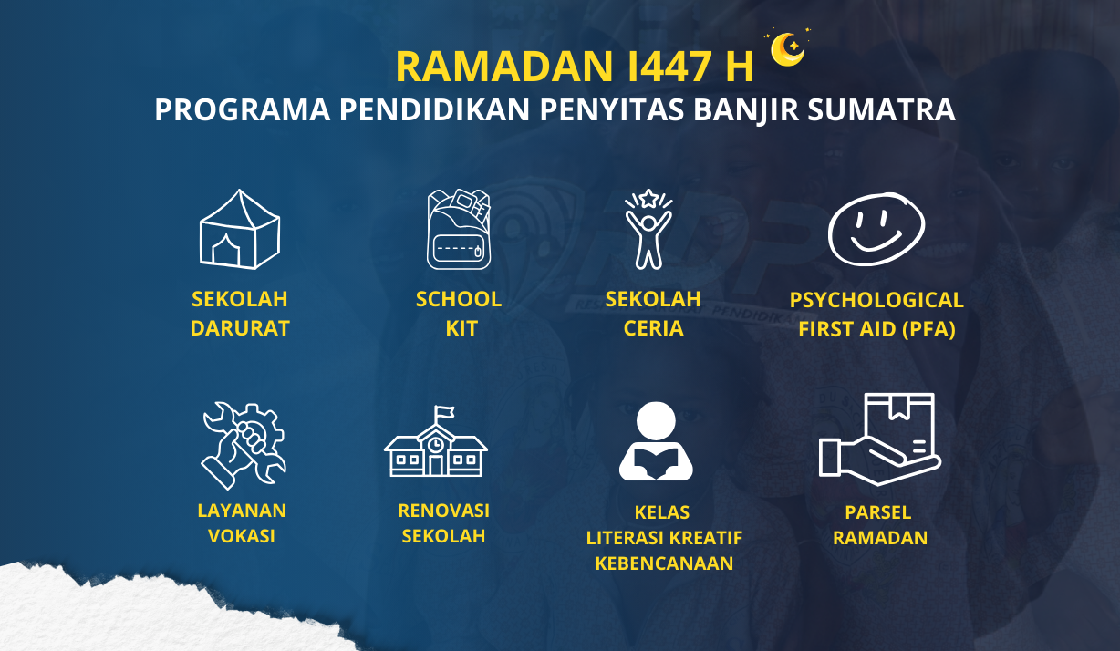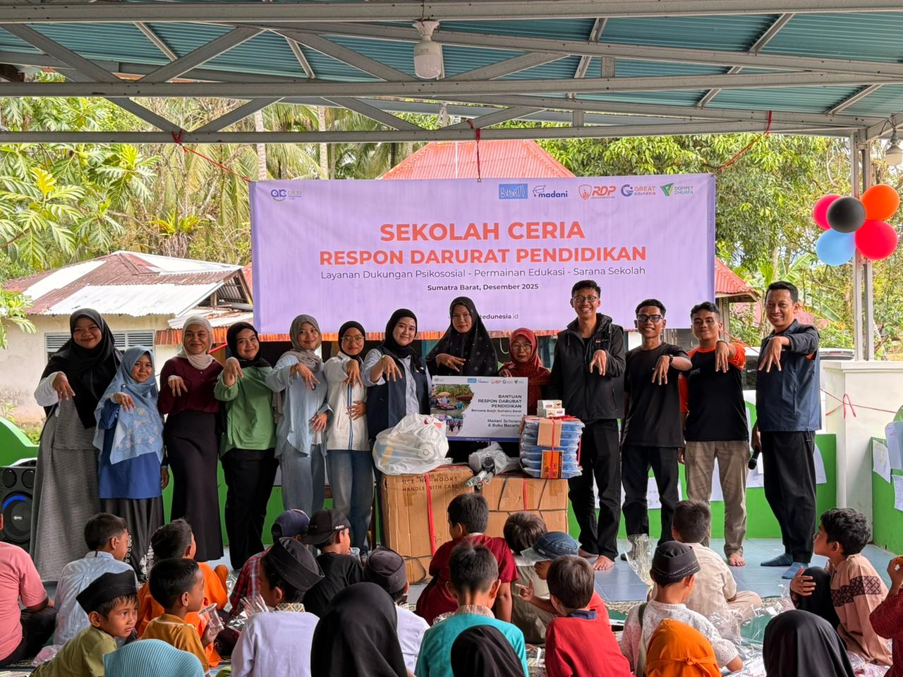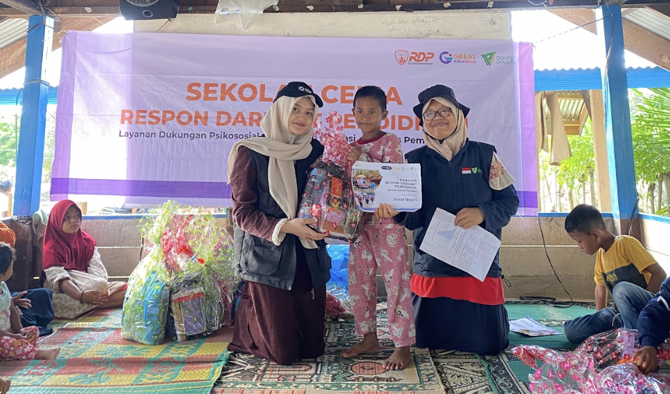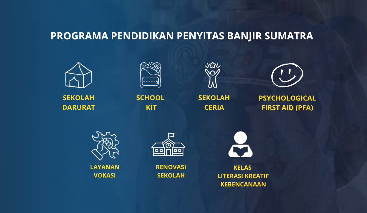 Melalui Sekolah Ceria, anak-anak mendapatkan layanan dukungan psikososial, permainan edukatif ramah anak, serta kegiatan literasi menggunakan Modul Kelas Literasi Kreatif Kebencanaan. Selain aktivitas pemulihan, donasi juga disalurkan dalam bentuk school kit dan sarana pendukung pembelajaran untuk membantu keberlangsungan proses belajar mengajar meskipun fasilitas sekolah terdampak bencana.